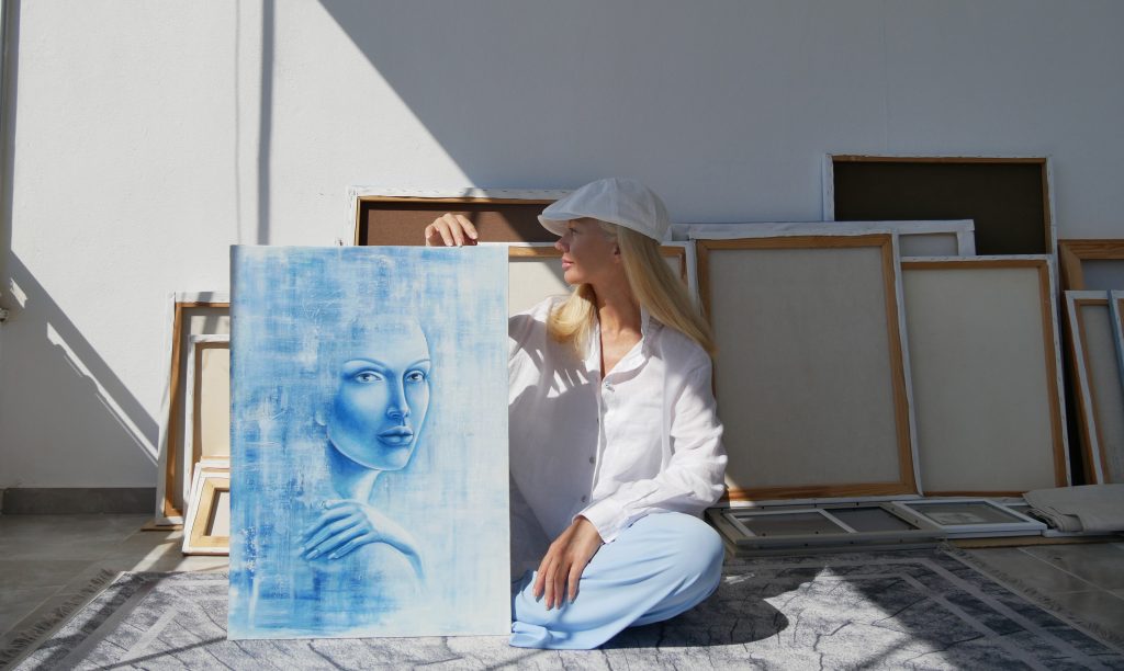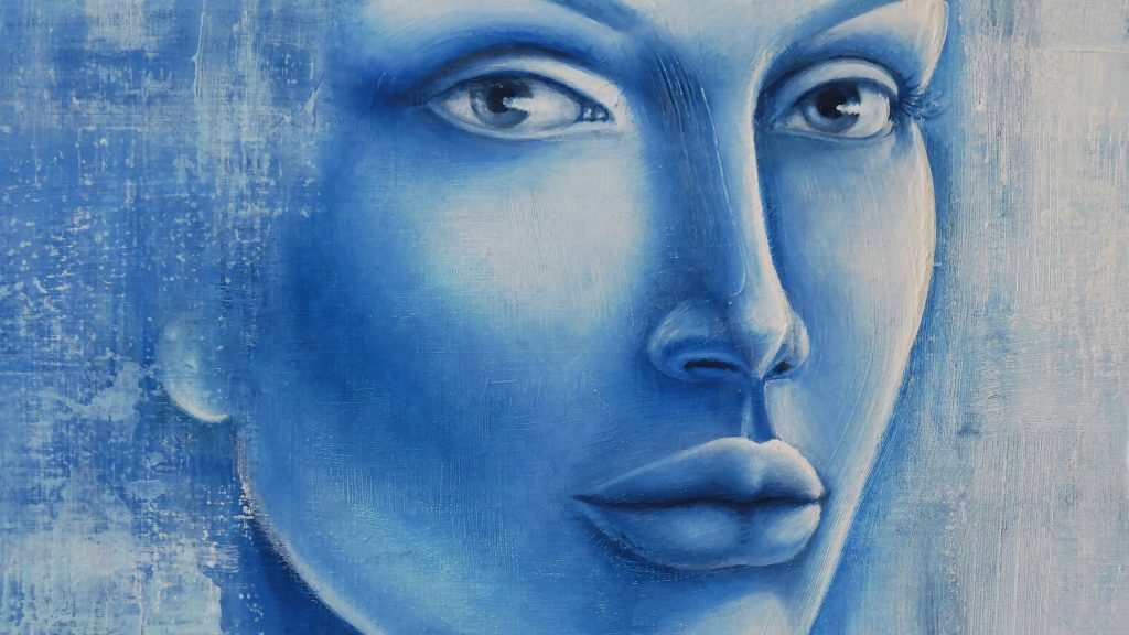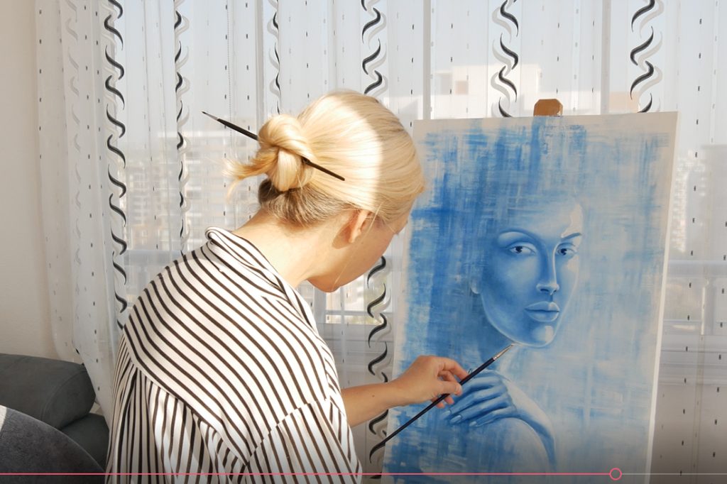 The idea of this portrait originates from the fact that being a woman in this world is a separate art.  We have to be as strong as tender,  princesses and achievers, mothers and money-making careerists, and all the other things that the world expects from us. Therefore, I depict this portrait of a woman in transparency, elusiveness, inaccuracy of the female image. Female image is the only object of my art, manifested in a variety of incarnations and situations of life. And this portrait I have made in blue monochrome to paint something unreal. There is something Gothic, mysterious, and incomprehensible in this painting. And in this state, there is my story of fillings experiences, because I did this work in the first months of my move to Turkey.  And all my feelings of loneliness, adaptation and at the same time calmness, because I am where I want to be, makes me to paint a woman image in the similar state.