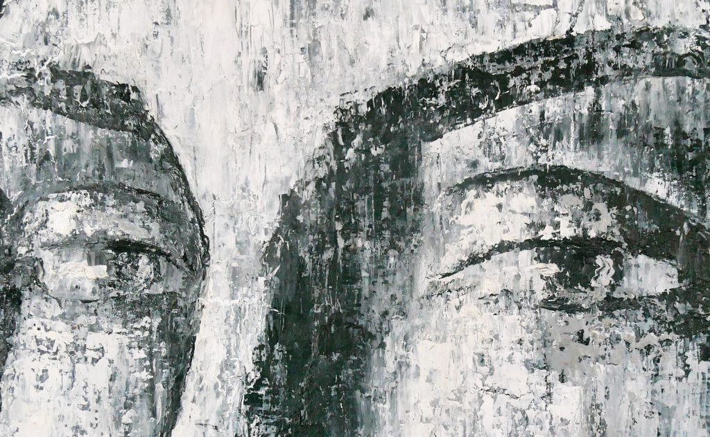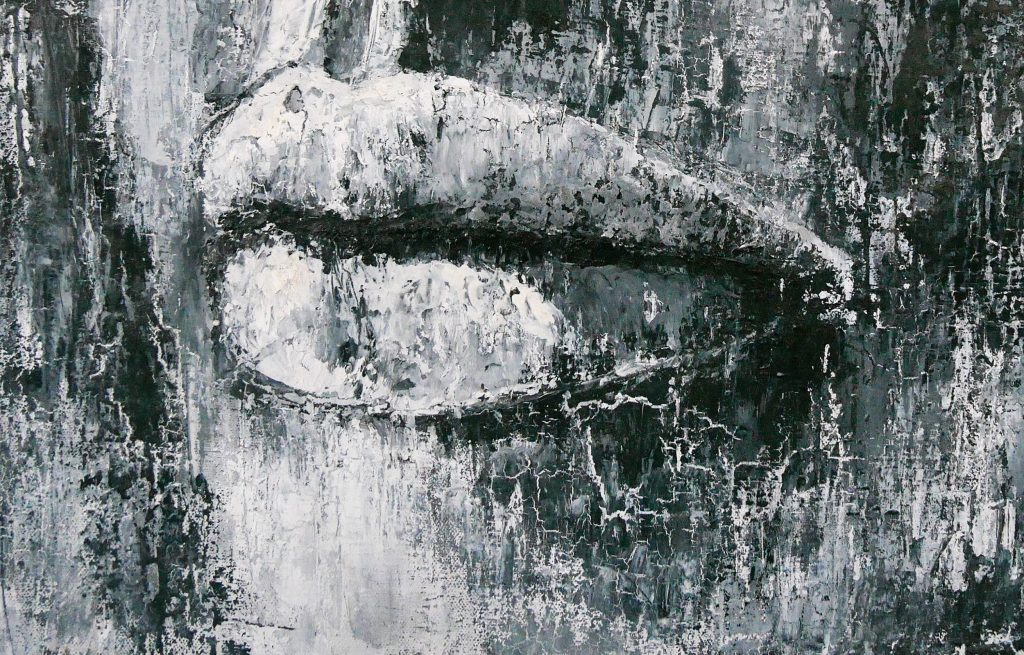 Executed in a modern abstract expressionist style, the painting features dynamic brushstrokes and textured layers created with a palette knife. The monochrome palette of deep dark gray and black, whites, and rich indigos creates a sense of fluidity and structure, causing the face to appear and disappear within the composition like a fleeting memory or an unspoken thought.