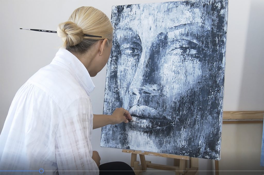 Joan of Arc in a modern interpretation—the title reflects the essence of the artwork: illusion, layers, and the play of perception. I called this painting “Looking Forward” because of all the work I did when the war between Russia and Ukraine had already been going on for half a year. There was no longer hope that this was just a short special operation, as everyone had been talking about. I left my country and have been living in expectation that this horror would end. But the concept of this painting is not about the war. I do not draw anything but female images. This is a female image depicting feelings about the war. I couldn’t draw for a long time. I felt powerless because I could not influence or change anything. But at the same time, these feelings of resistance and disagreement made me change my life, because this was the only thing I could influence and change, and I decided to move to the sun and the seaside.