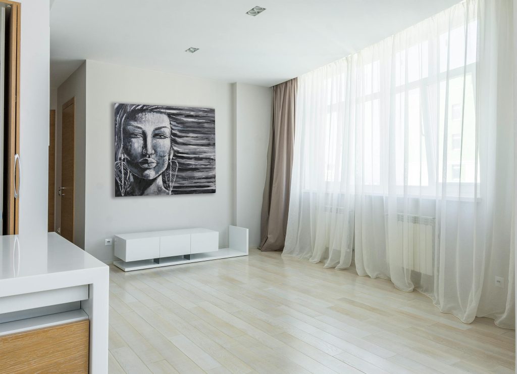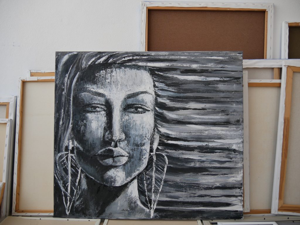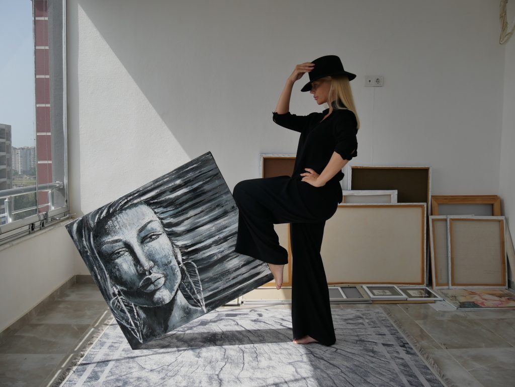 For Photoshop previews, I prefer photographs of a modern minimalistic interior, often monochrome colors, white, gray, black, light and calm, or brutal and dominant, because my paintings ideally fit into such a design. The main detail that I would like to highlight in this portrait is the face plunging into darkness. This is the light that falls from the right to the left side, highlighting and making the deep details. These details create the face of a modern woman It is always very important to think and talk about the impression that the picture makes.